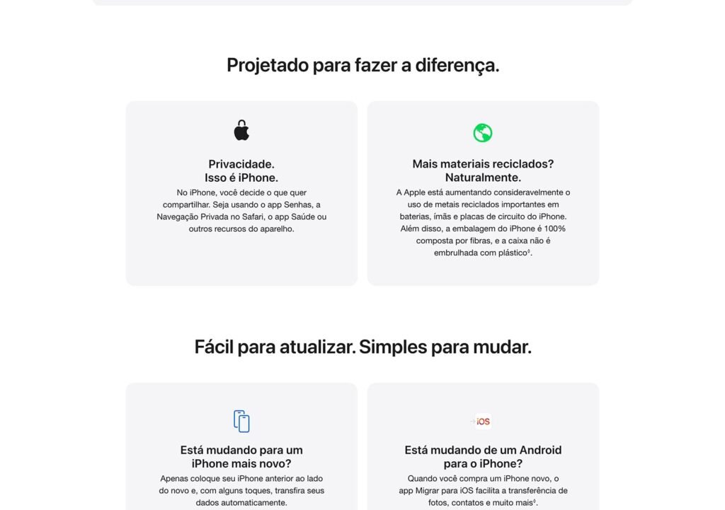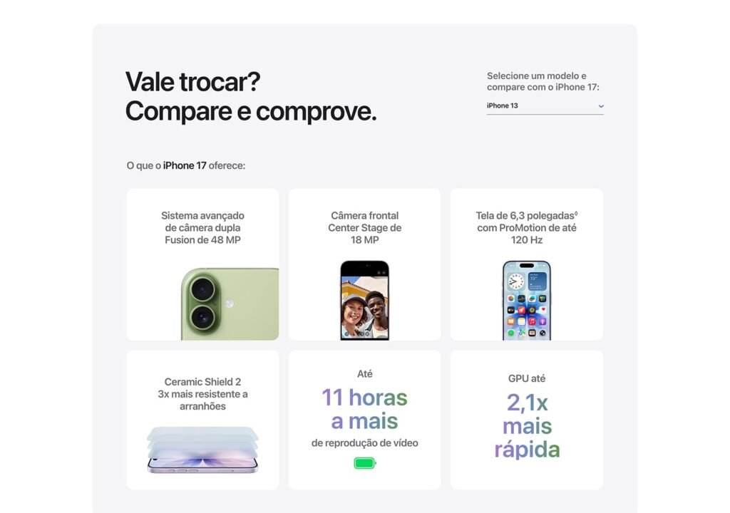 A bateria foi projetada para acompanhar longas rotinas, oferecendo até 30 horas de reprodução de vídeo, além de carregamento rápido, que atinge 50% em apenas 20 minutos. O sistema iOS 26 traz um novo visual com Liquid Glass, mais personalização, fluidez e recursos inteligentes que elevam a experiência do utilizador.